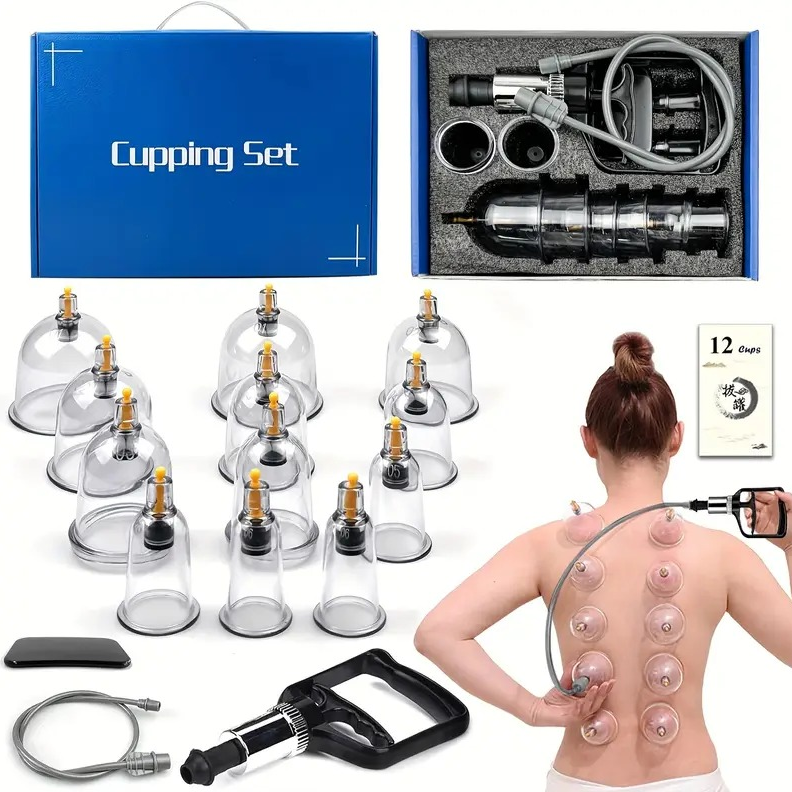 This 12-cup cupping therapy set is designed for convenient at-home wellness and massage routines. Featuring multiple cup sizes and a manual suction pump, the set allows adjustable suction control and flexible placement across different areas of the body. The included extension tube supports easier self-use, while the durable cups and accessories store neatly in the included case for organization and portability. Designed for repeated use, this kit offers a practical setup for personal relaxation and body care routines.